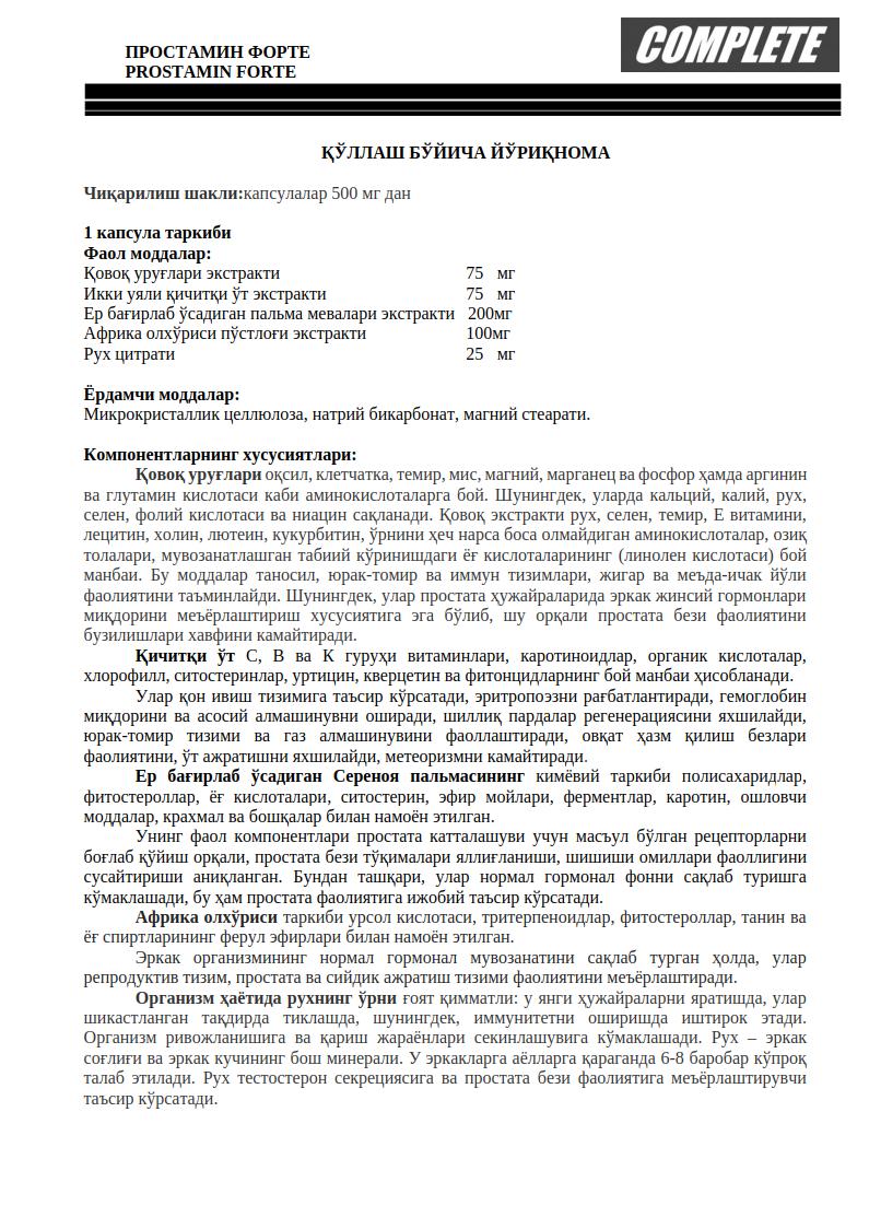 Экстракт семян тыквы 75 мг Экстракт крапивы двудомной 75 мг Экстракт плодов пальмы ползучей 200 мг Экстракт коры африканской сливы 100 мг Цинка цитрат 25 мг |