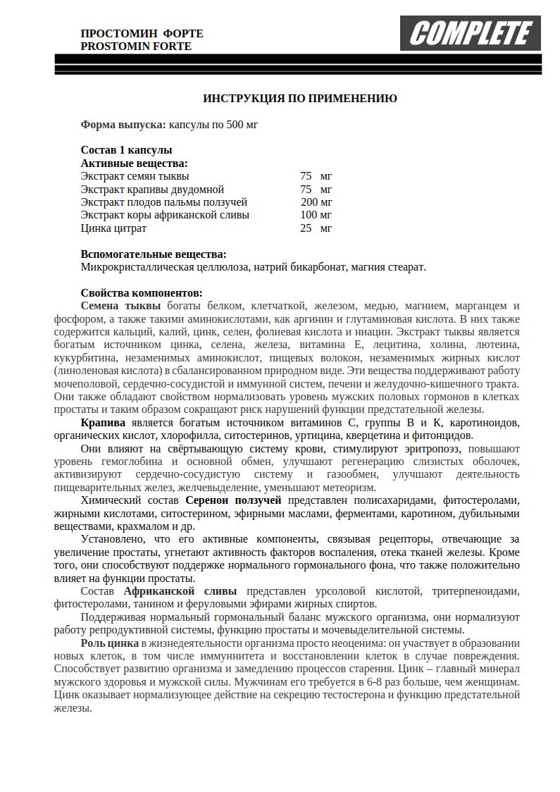 Экстракт семян тыквы 75 мг Экстракт крапивы двудомной 75 мг Экстракт плодов пальмы ползучей 200 мг Экстракт коры африканской сливы 100 мг Цинка цитрат 25 мг |